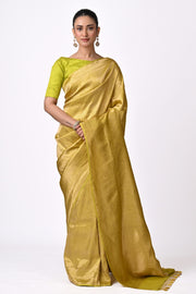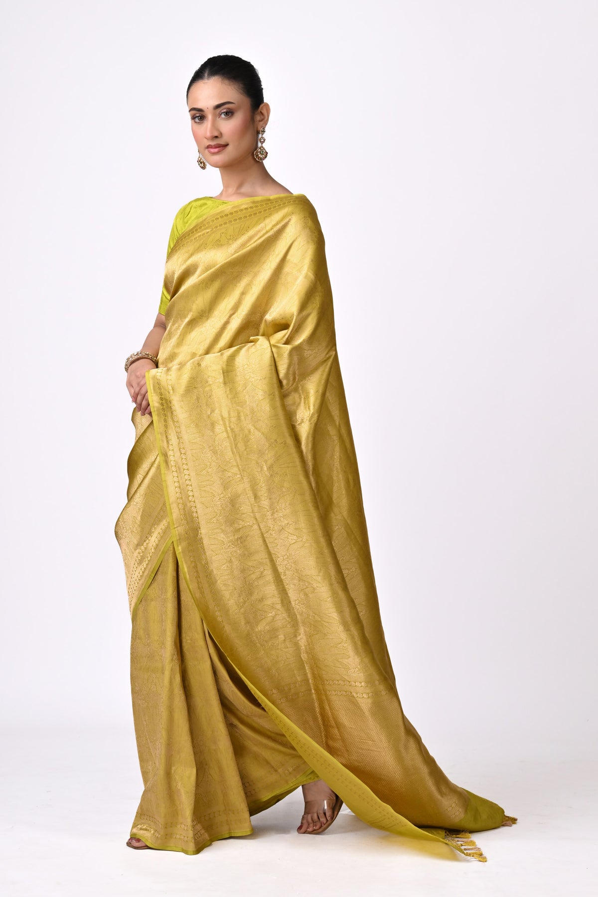 Embrace the rhythmic complexity of traditional brocade in this olive gold Katan silk. A masterpiece of artisanal weaving for a sophisticated, modern silhouette.