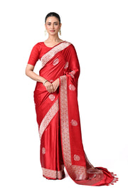A Red Gajji silk saree adorned with rhythmic floral jaal, blending heritage artistry and refined elegance in an artisanal weave.