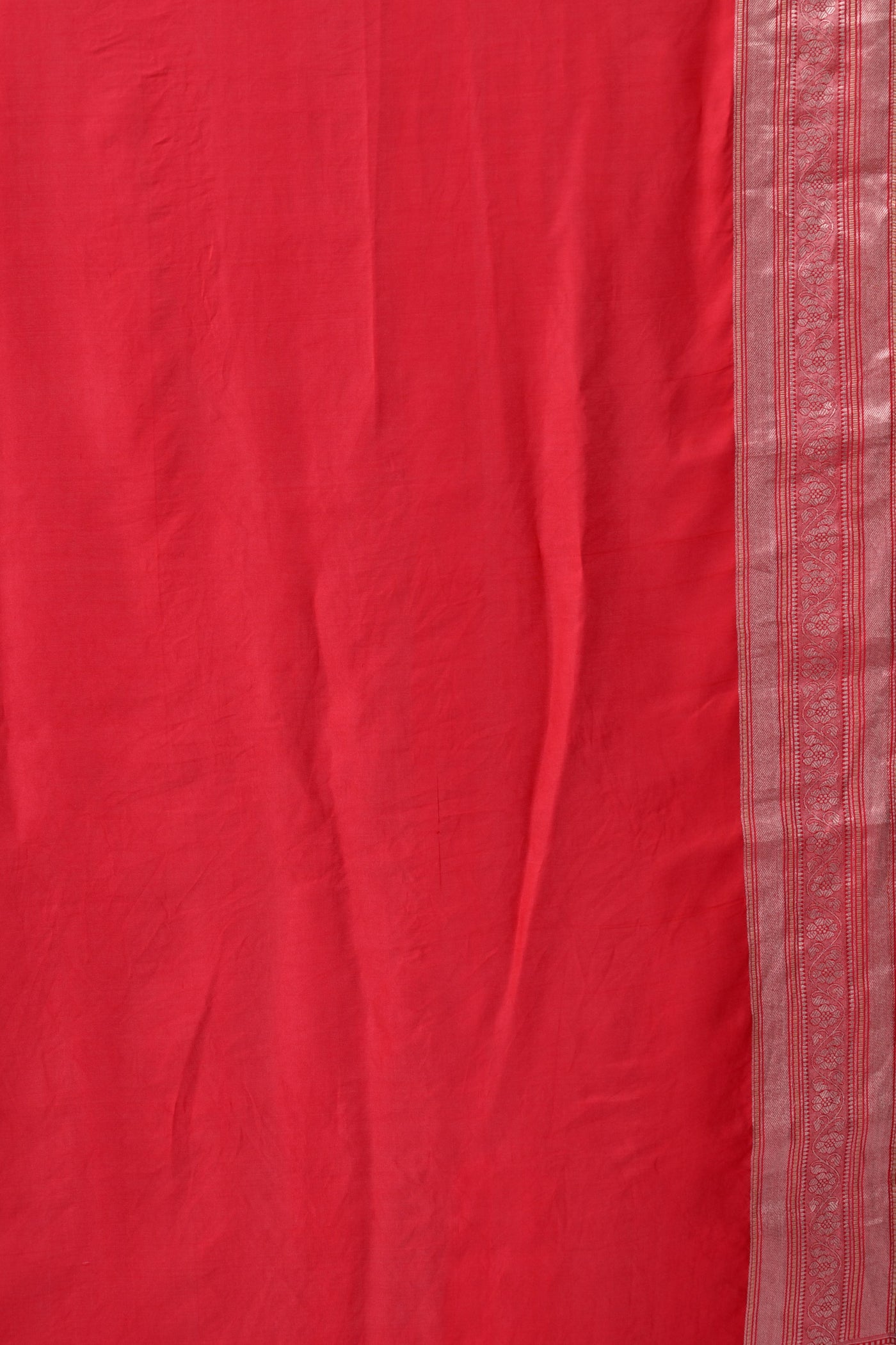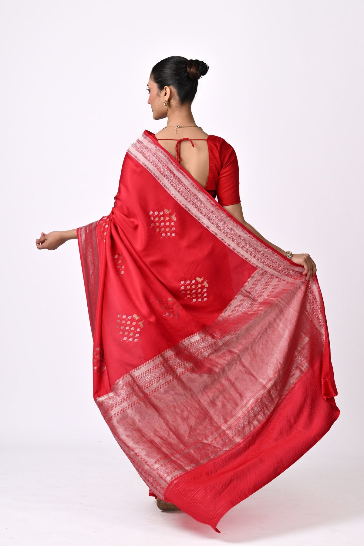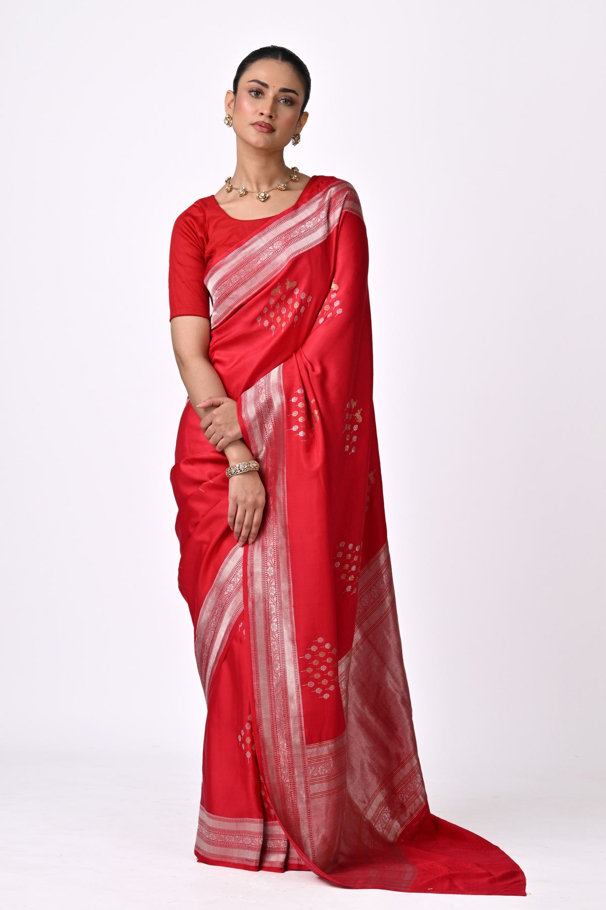 Radiant and regal, this crimson red silk saree features rhythmic geometric motifs and artisanal zari.