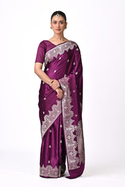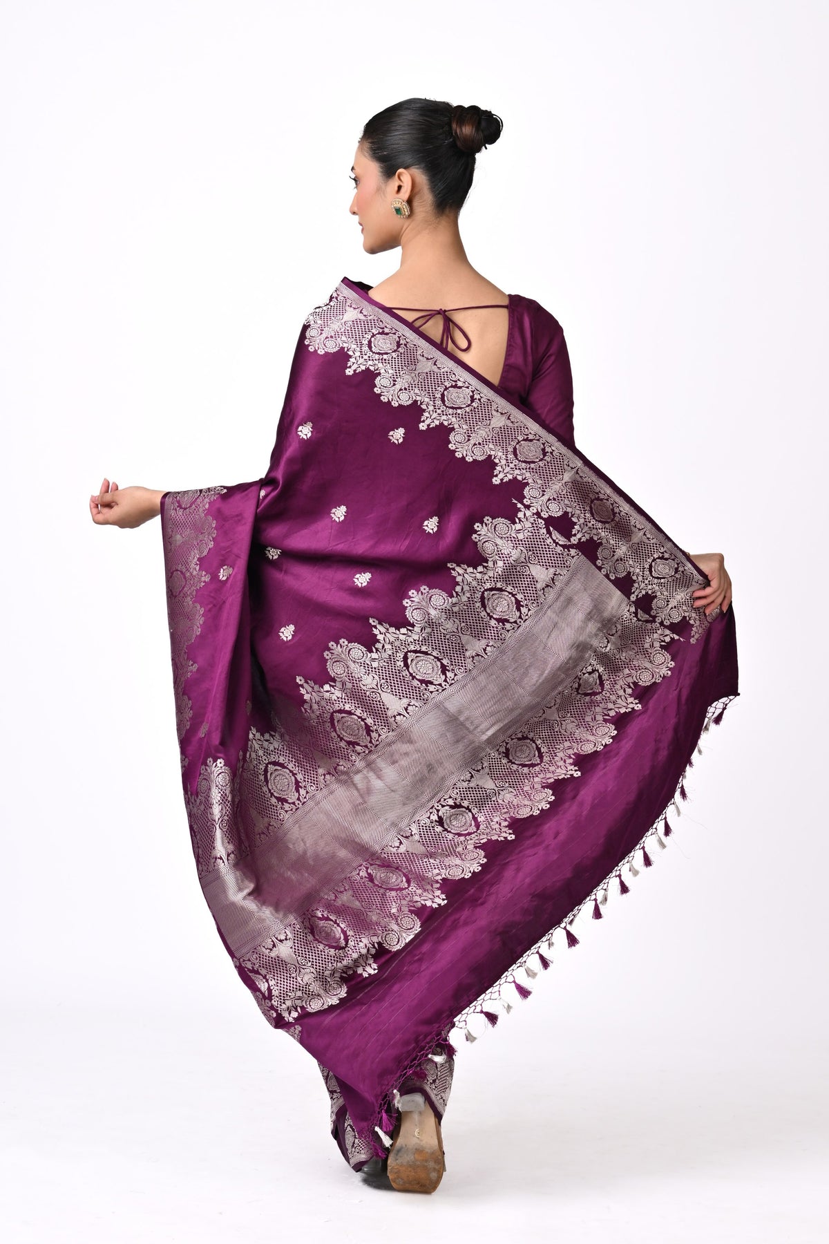 Embrace the rhythmic, artisanal charm of this deep plum pure Katan silk saree. A heritage essential defined by masterful, intricate zari work.
