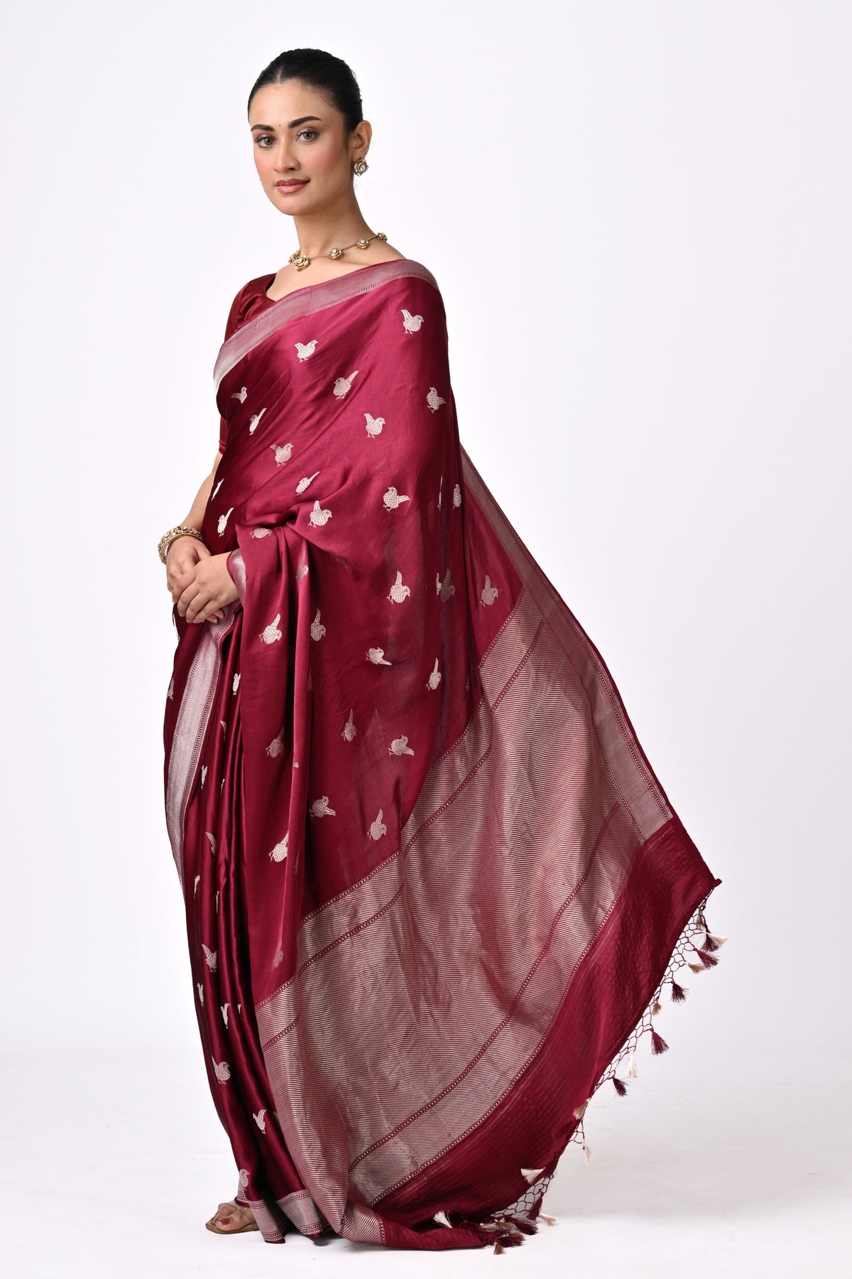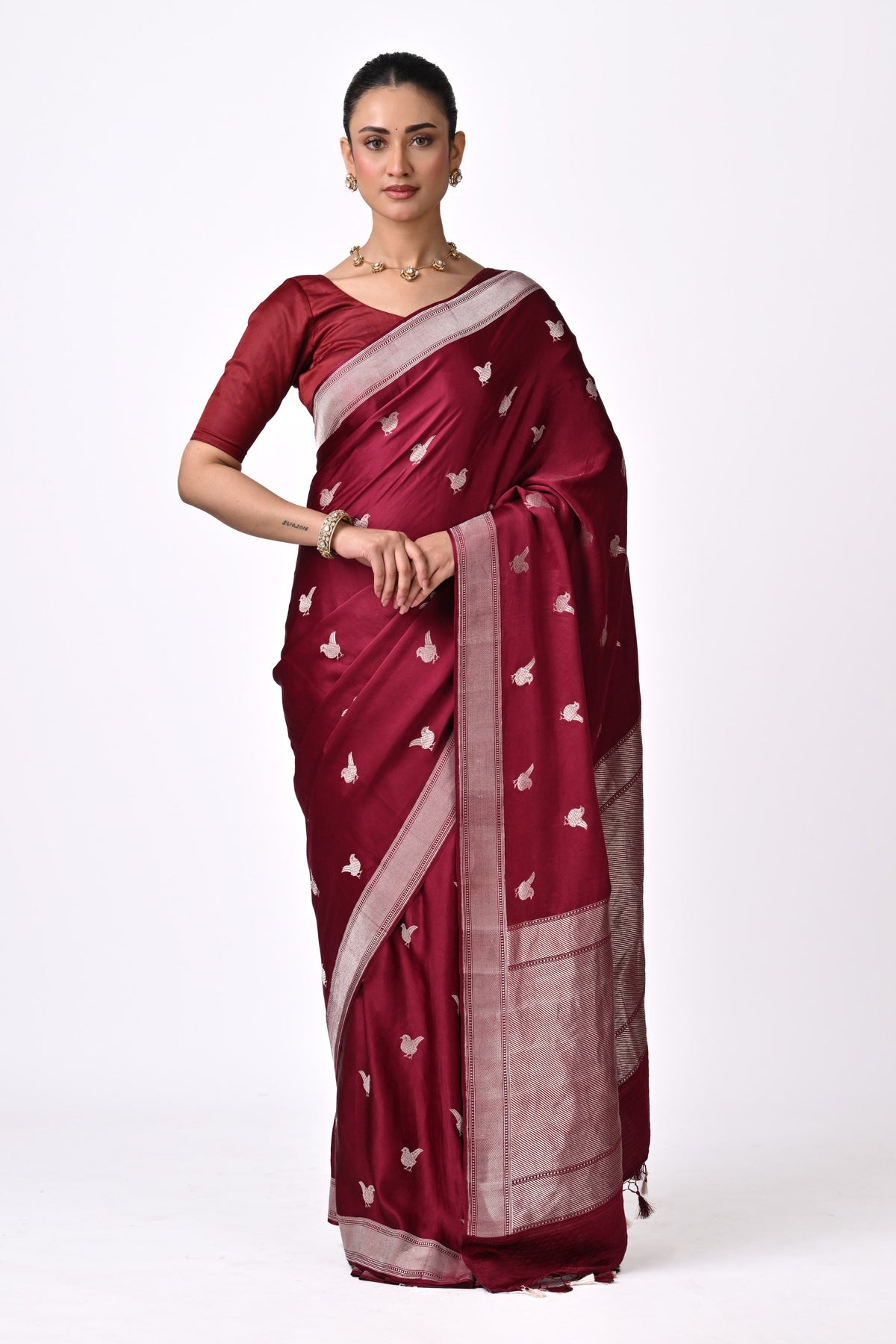 Drape yourself in the rich textures of our heritage wine silk. This artisanal saree features rhythmic bird motifs and silver zari.