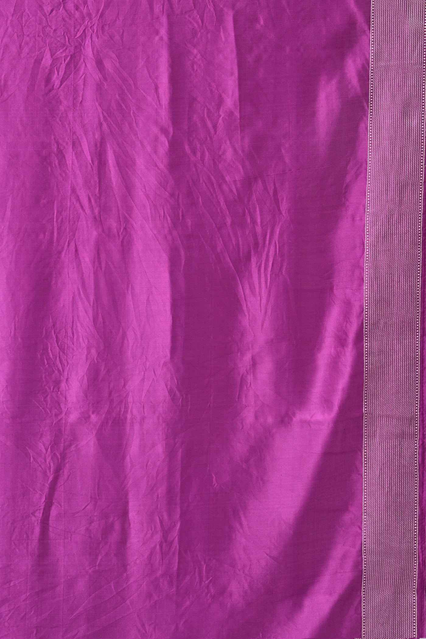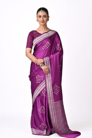 Reveal your luminous style in this plum pure Katan silk saree. Featuring artisanal, rhythmic zari butis, it is a sophisticated heritage piece.