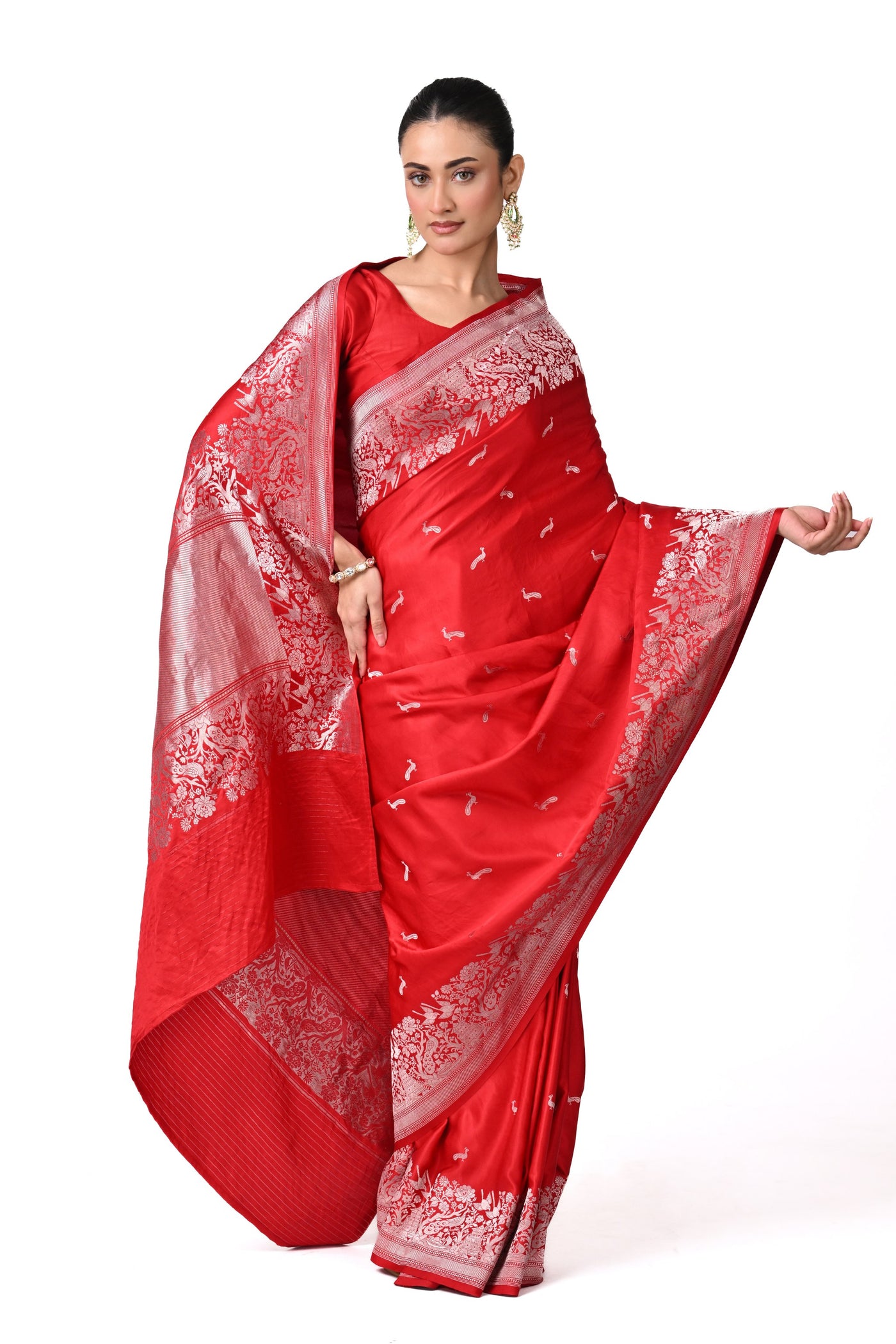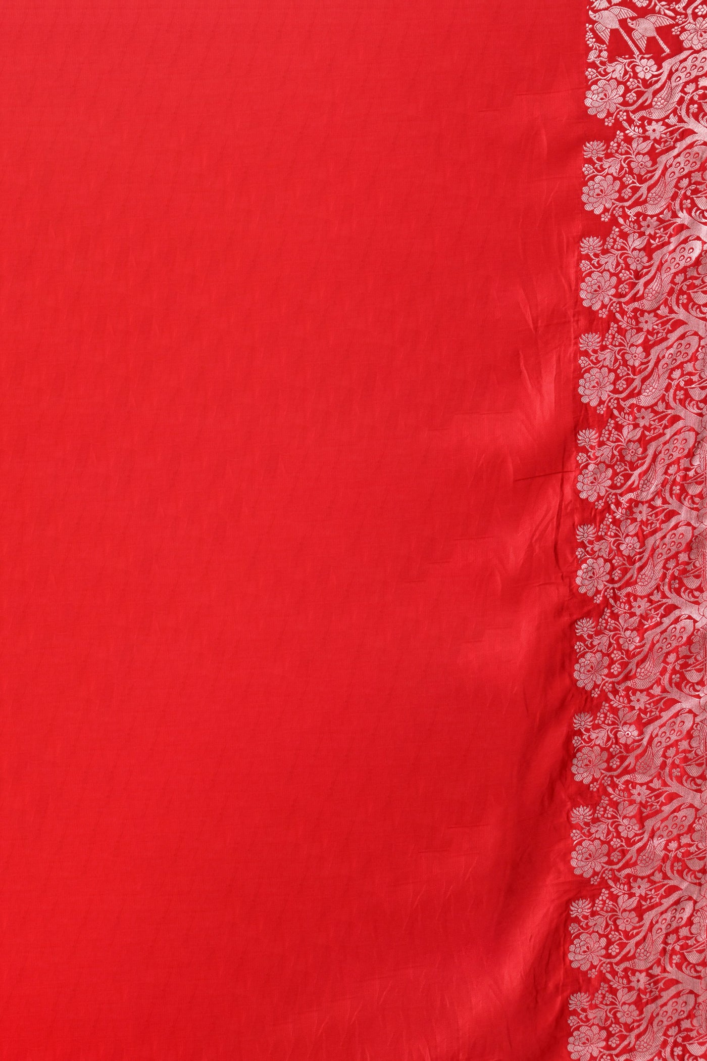 A modern red Gajji silk saree defined by subtle bird motifs and a sleek woven border, balancing artisanal craft with effortless elegance.