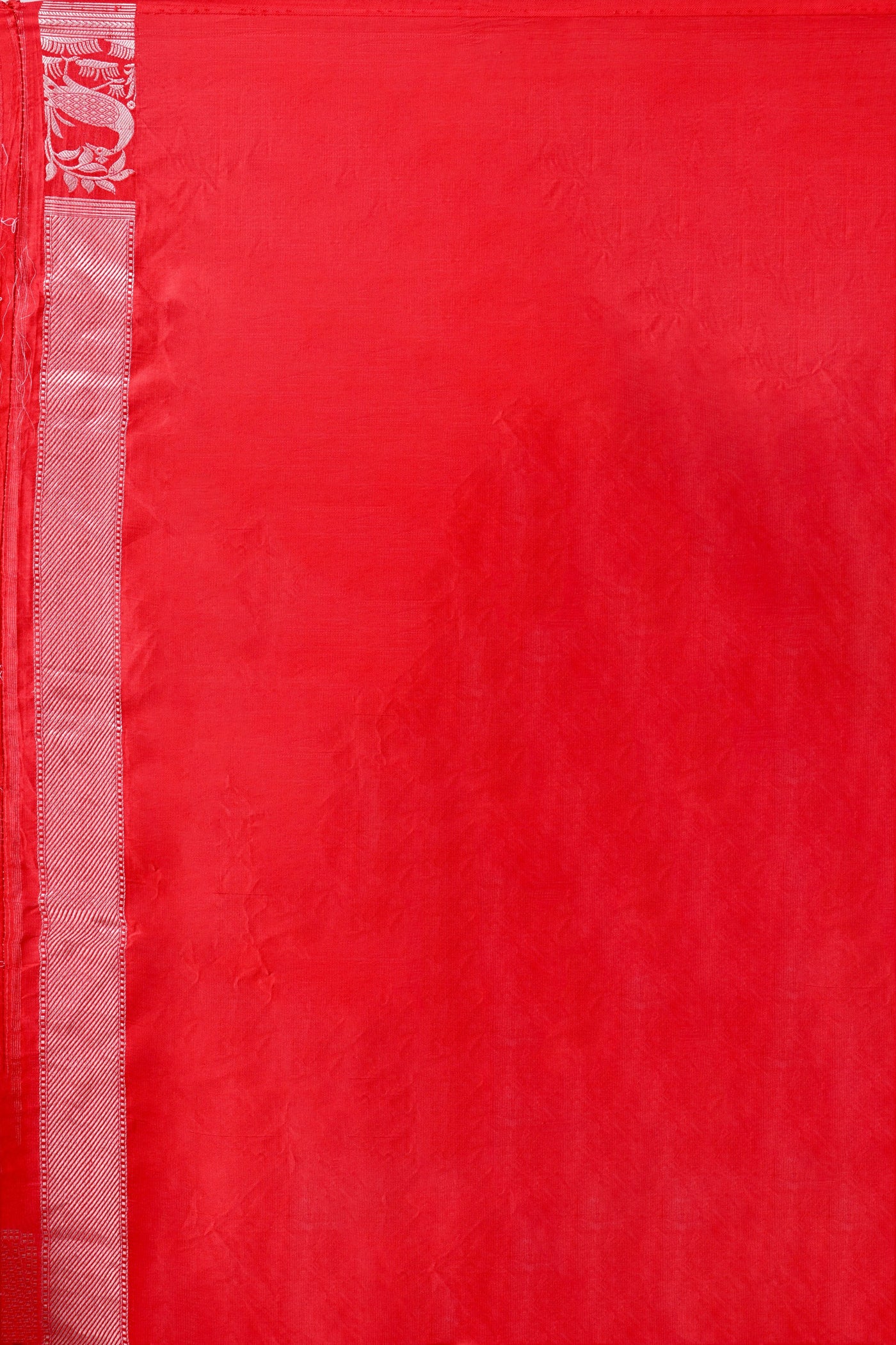A scarlet Gajji silk saree framed by an intricately woven heritage border and rhythmic motifs, celebrating artisanal elegance.