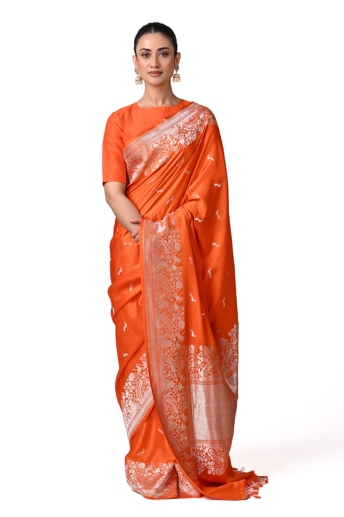 Celebrate traditional artistry with this handcrafted silk saree by Atelier Gajji. Adorned with delicate, silver-woven peacock motifs and an ornate zari border.