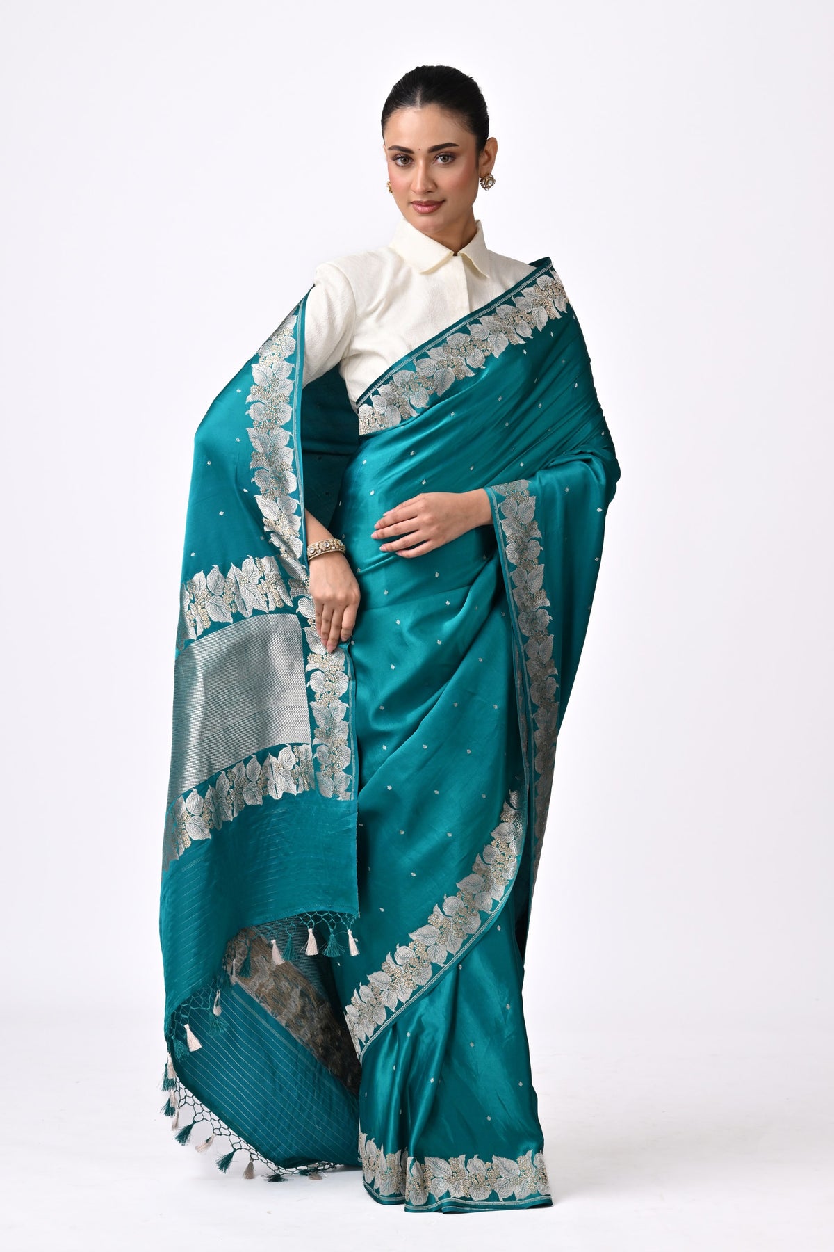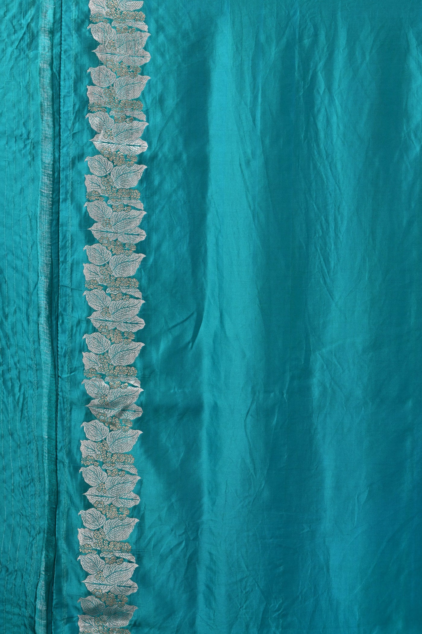 Discover the rhythmic grace of this teal Gaji silk saree, featuring an artisanal scalloped floral border. A contemporary heritage masterpiece.