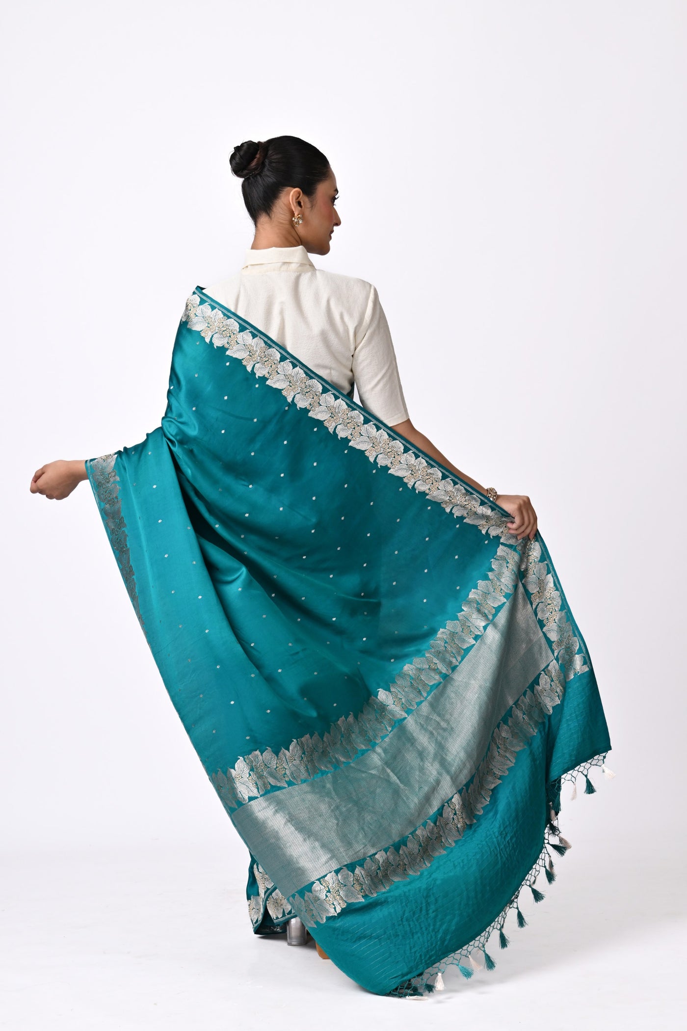 Care: Dry clean only. Store the sari in a muslin cloth away from sunlight in a dry environment. Air the sari every few months.