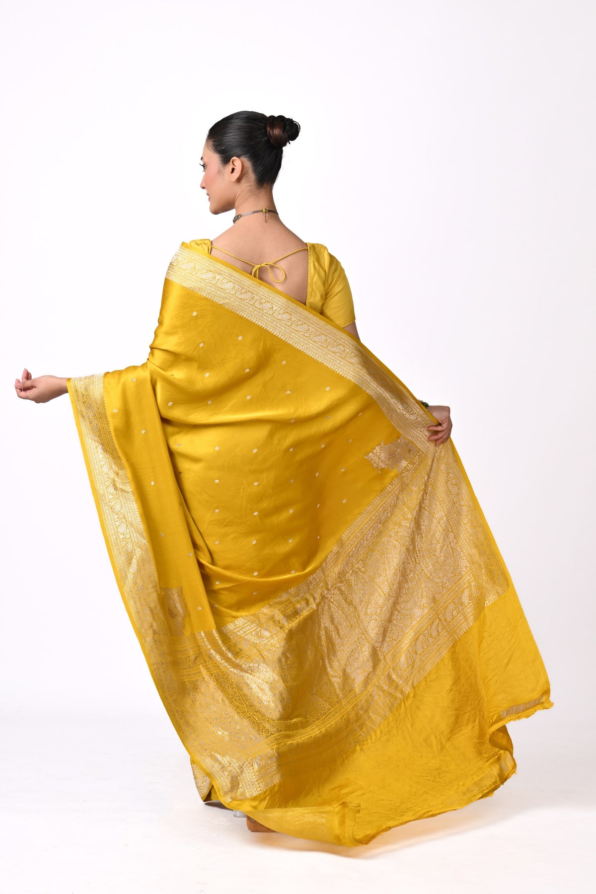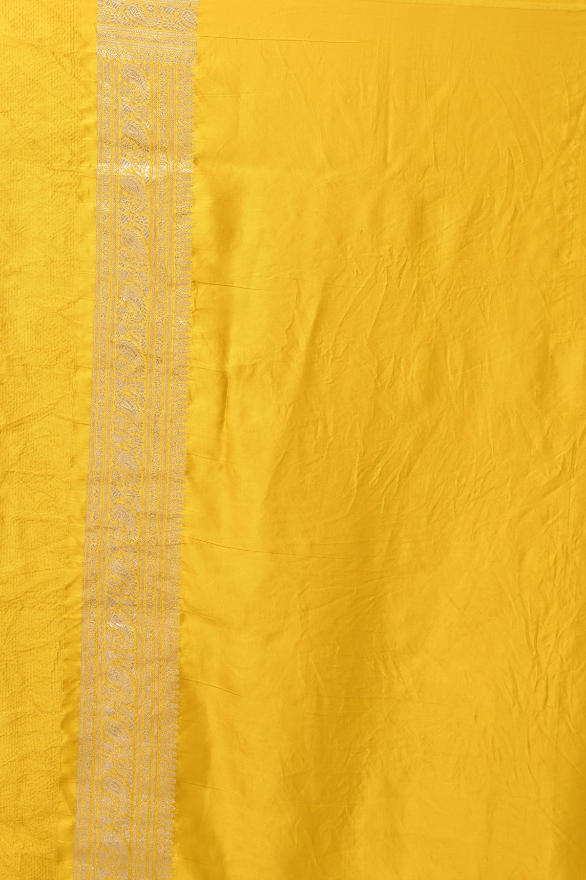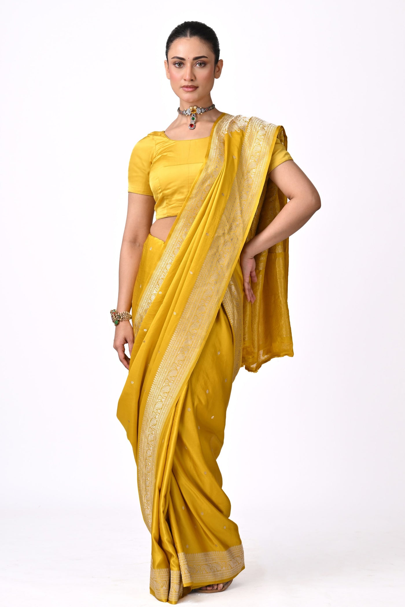Adorn yourself in this luminous, mustard pure Katan silk masterpiece. Featuring artisanal, large-scale floral motifs, it’s a regal choice.
