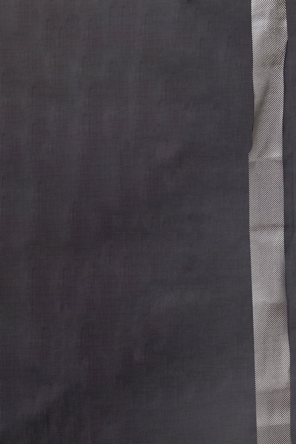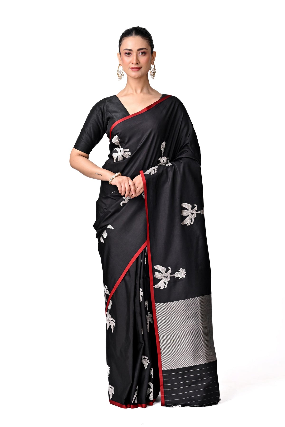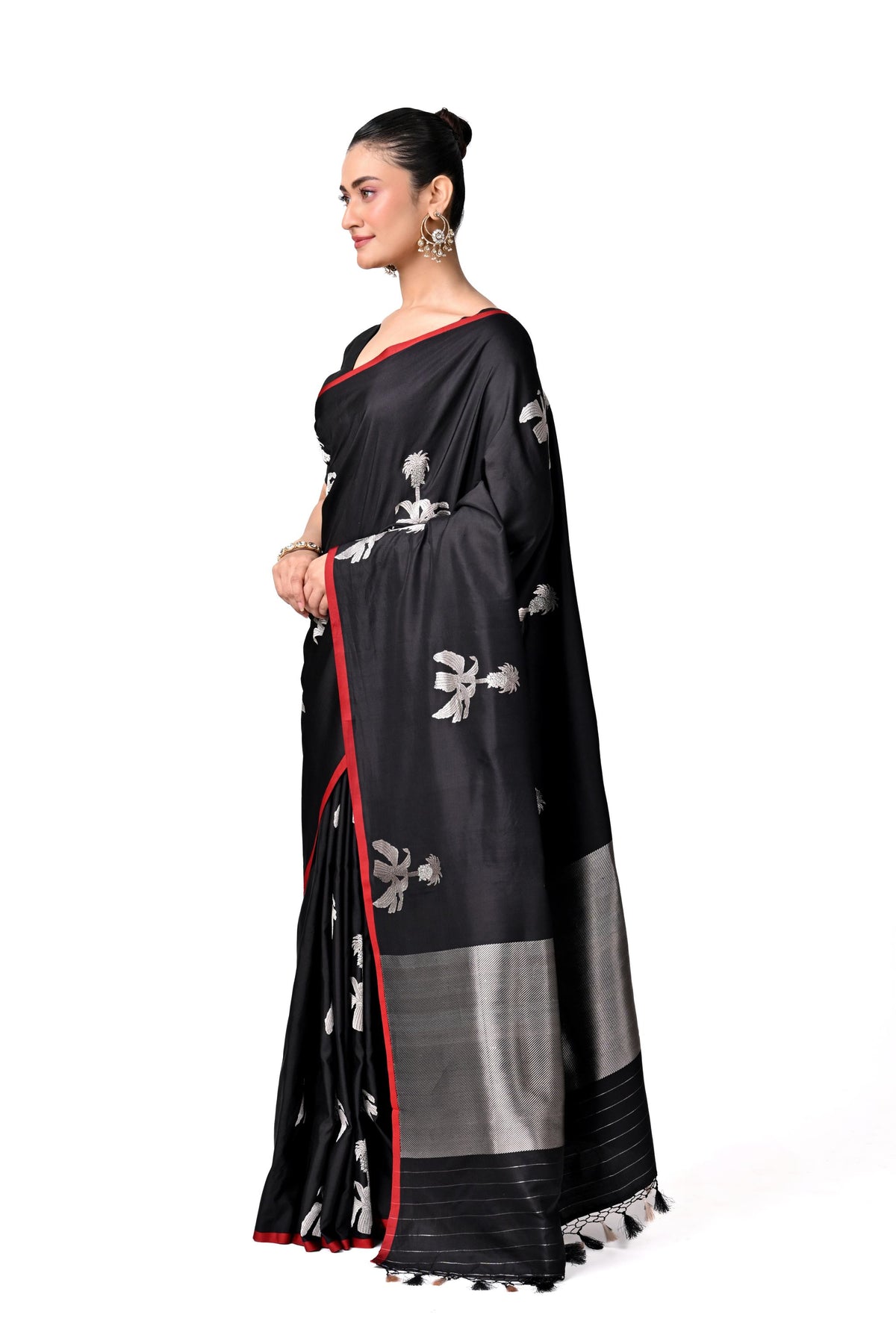 Handcrafted Ektaara Benaras in Black and silver botanical motifs with a red selvage.