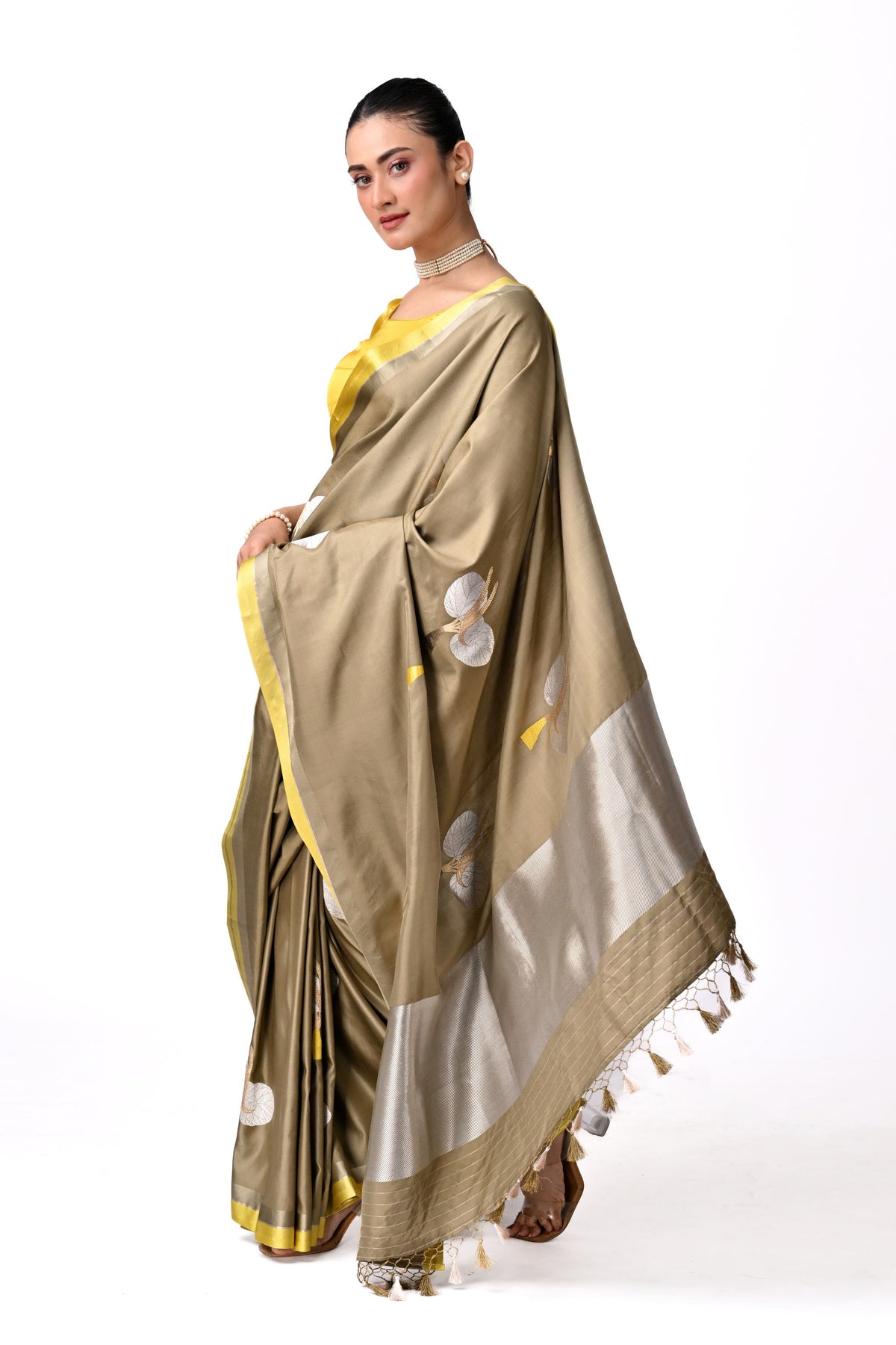 Handcrafted Ektaara Benaras in olive gold and silver botanical motifs with yellow mashru border.