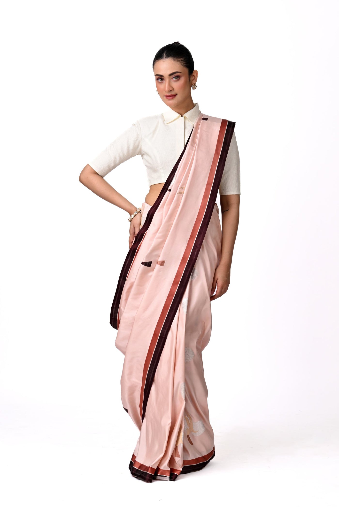 Handcrafted Ektaara Benaras in Peace and silver botanical motifs with Brick red and chocolate mashru border.