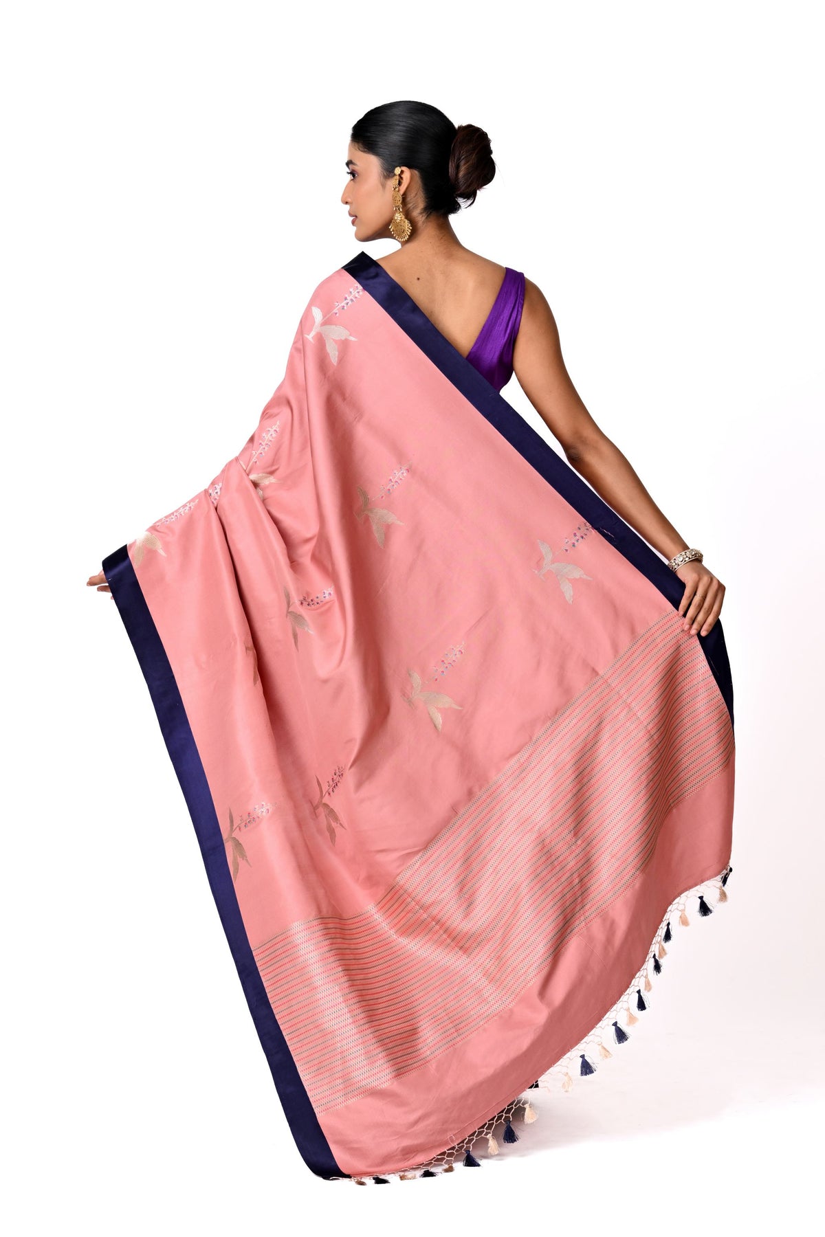 Handcrafted Ektaara Benaras in Pink and silver botanical motifs with Navy mashru border.