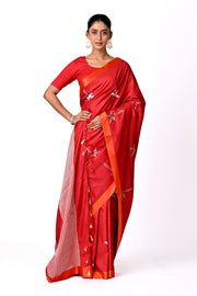 Handcrafted Ektaara Benaras in Red and Silver botanical motifs with Orange mashru border.