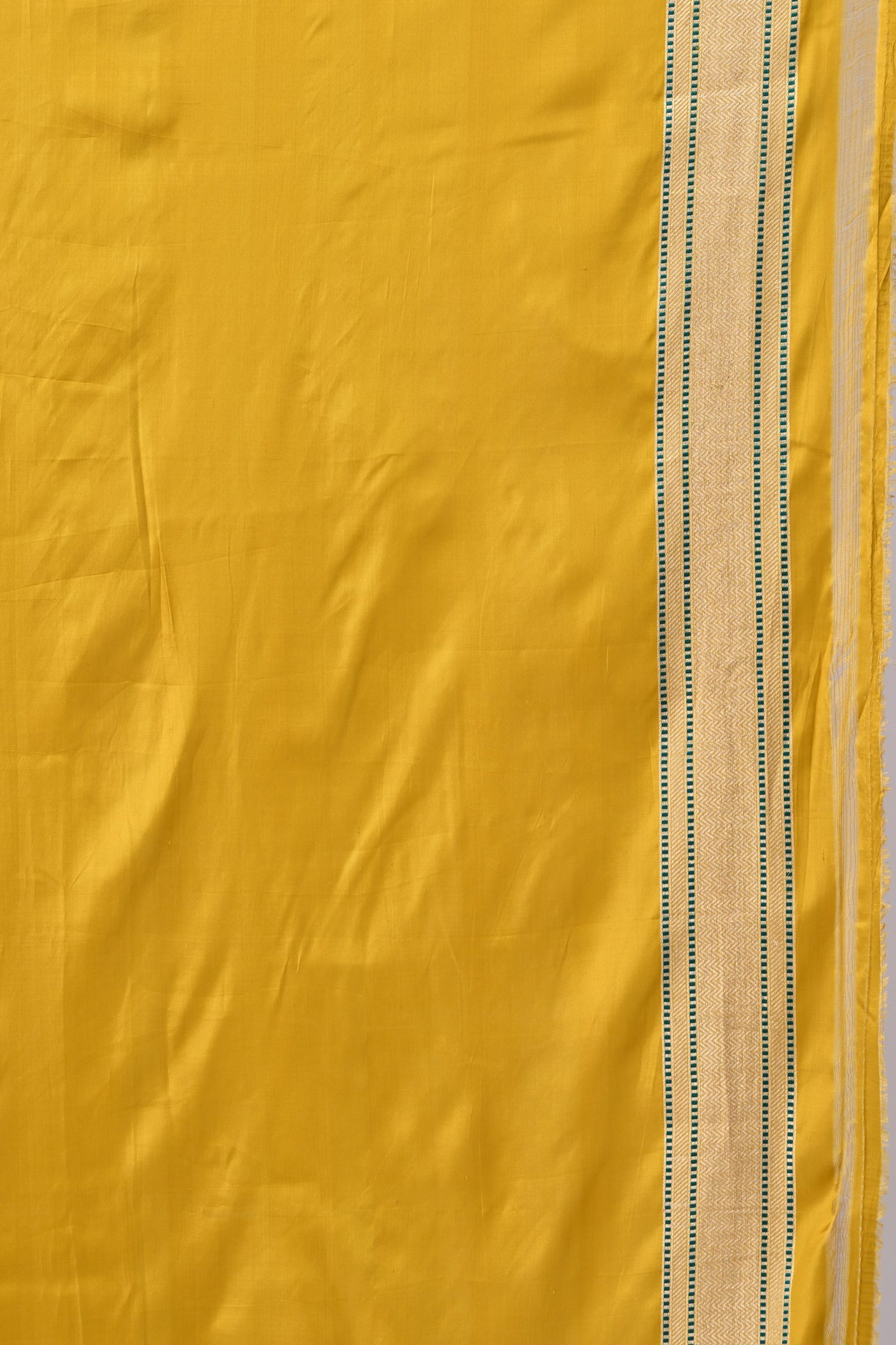 Celebrate brilliant elegance in this gold-toned pure Katan silk saree. Featuring artisanal floral details, it is a unique heritage treasure.