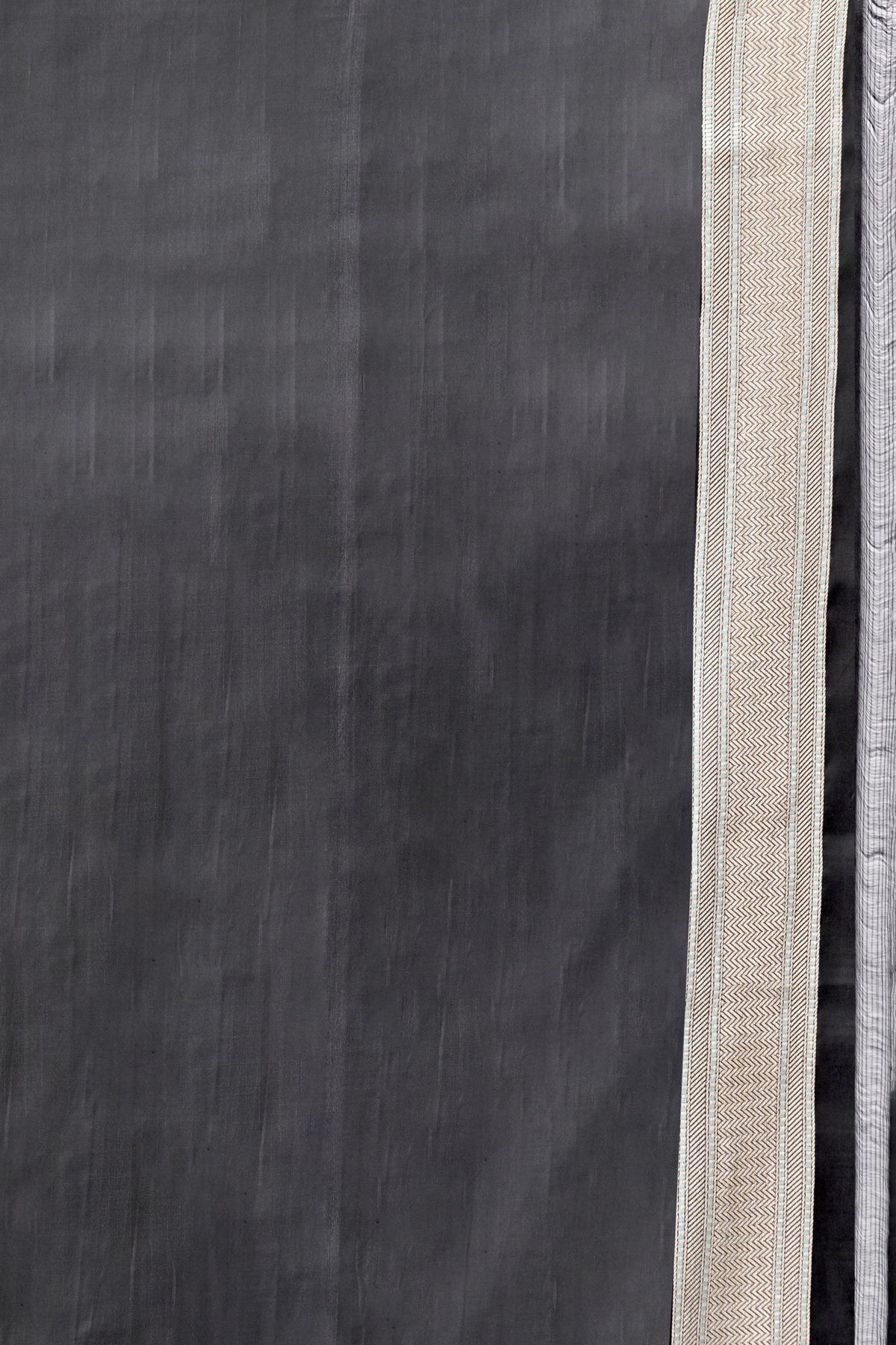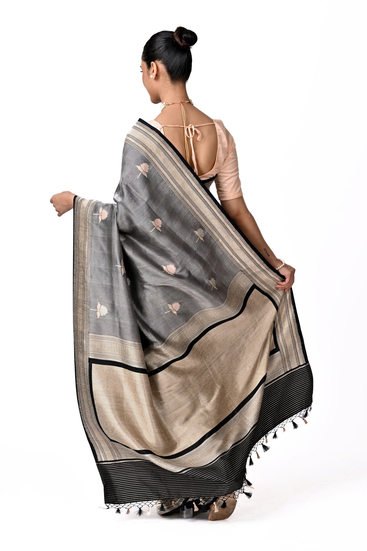 A elegant silver and black twill saree with delicate meenakari motifs, crafted with heritage artistry and a rhythmic drape.